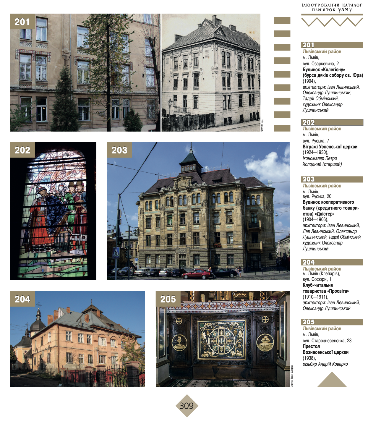 Книжка поділена на дві частини: у першій подано 101 пам’ятку з анотацією та декількома фото, а в другій — каталог за областями, із зазначенням адреси, архітектора і фото споруди. Загалом в альбомі йдеться про 587 об’єктів, левова доля яких — будівлі.