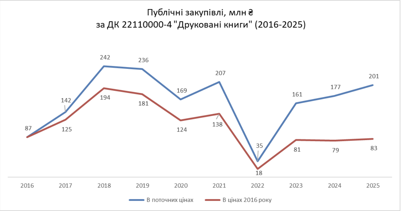 Найбільше закупівель на суму 386 мільйонів гривень протягом 10 років здійснили за державною програмою поповнення бібліотечних фондів Український інститут книги (понад 297 мільйонів гривень, протягом 2018-2021 років) та Національна бібліотека імені Ярослава Мудрого (понад 89 мільйонів гривень, протягом 2016-2017 років). Наразі державна програма поповнення бібліотечних фондів не діє — її зупинили у 2022 році.