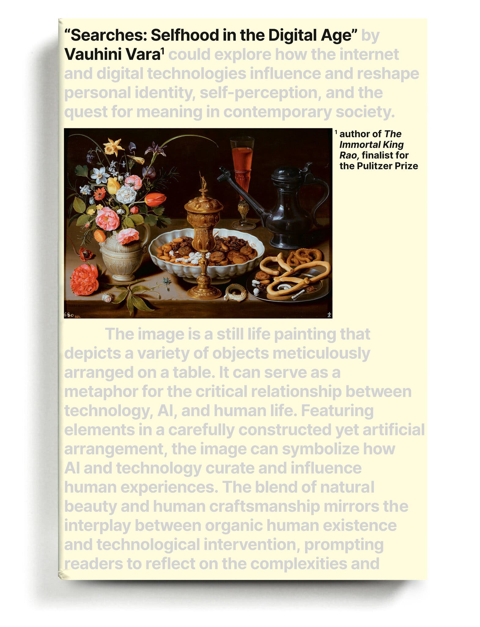 Проте варто відзначати обкладинки, які цього не роблять. Протягом року читання та перегляду я постійно помічав обкладинки, які не виглядали повністю як обкладинки до книг. Деякі з них були схожі на попередження, інші перетворилися на тривожні сигнали, а принаймні одна обкладинка містила нерозглянуте візуальне середовище довгого текстового огляду теми, створеного штучним інтелектом. Чи це трюки для привернення уваги? Чи їх затвердили, щоб знайти покупців в економіці короткої уваги? Чи вони стали результатом таємних зусиль дизайнерів включити сліди особистого самовираження? Сподіваюся, що все вищезазначене. Читання залишається популярним частково завдяки своїй здатності ділитися множинними взаємопов’язаними ідеями в обмеженій формі. Дизайн теж може це робити».