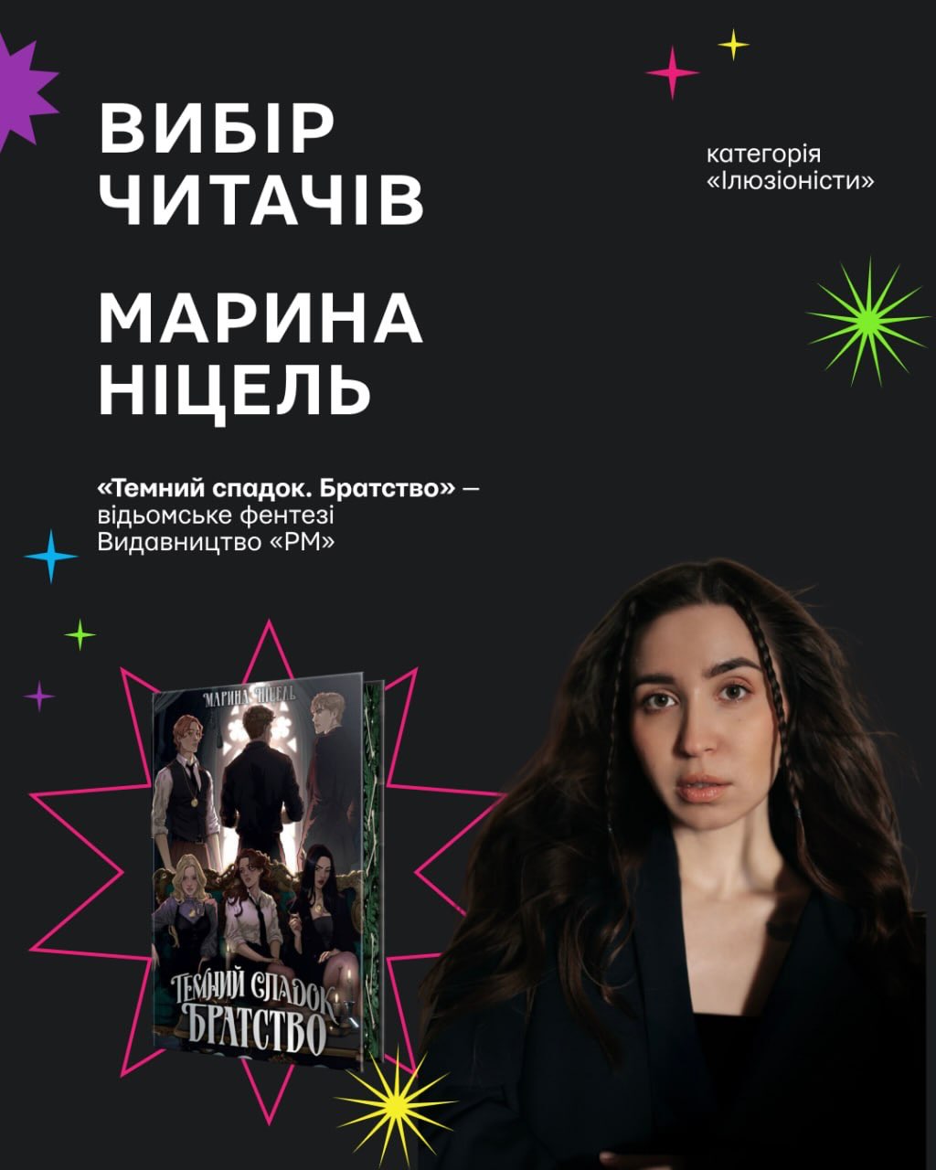 - у категорії «Ілюзіоністи»: Марина Ніцель із відьомським фентезі «Темний спадок. Братство».