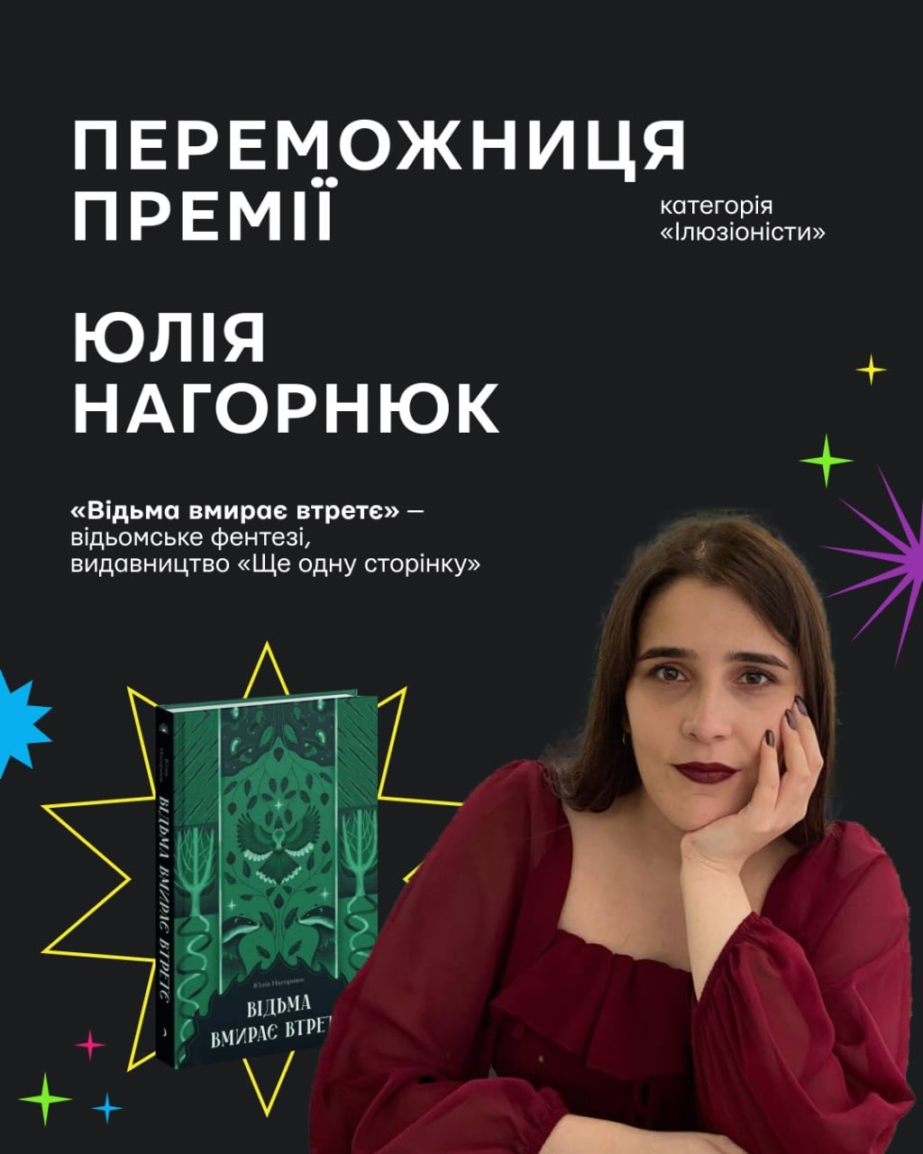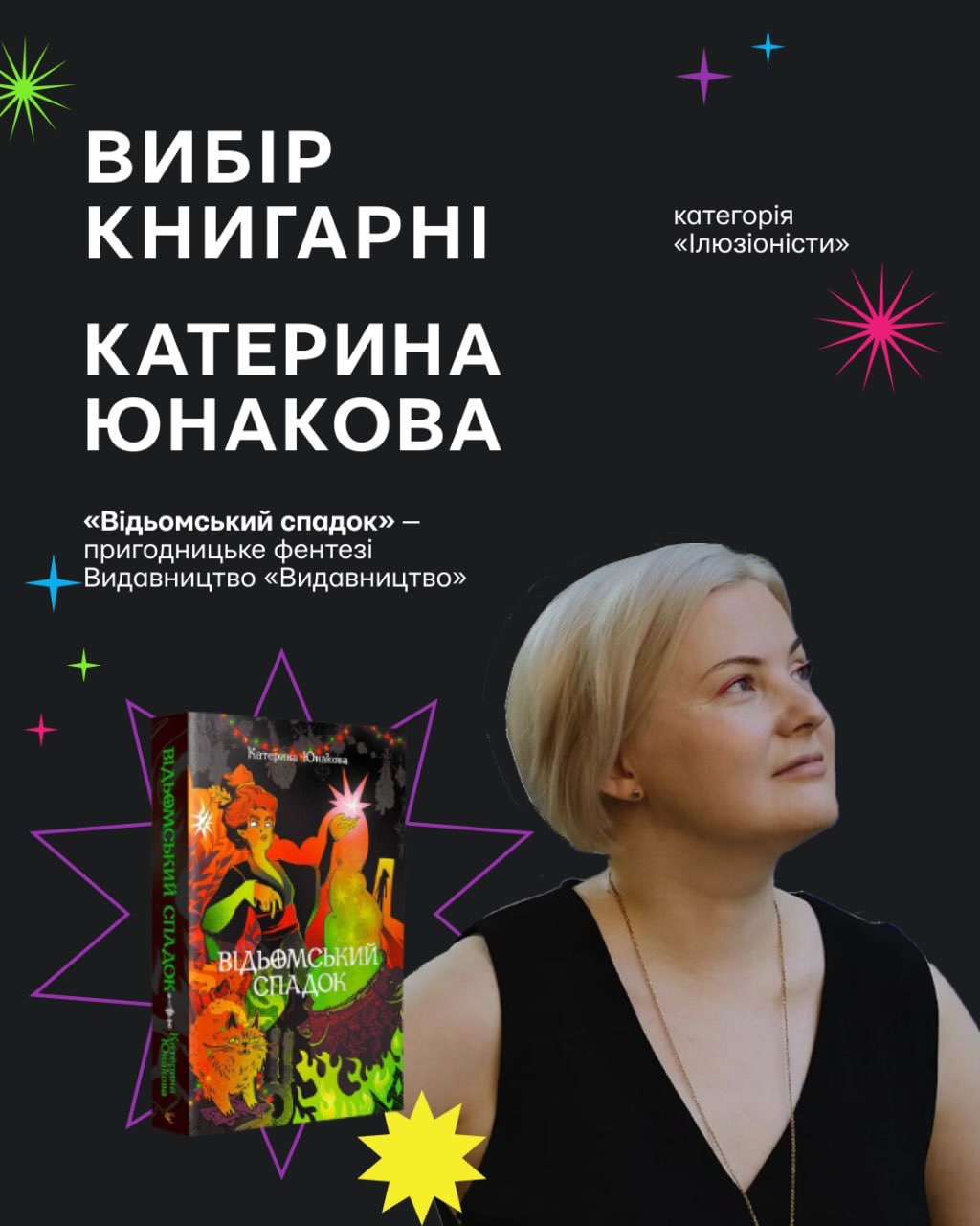- у категорії «Ілюзіоністи»: Катерина Юнакова з пригодницьким фентезі «Відьомський спадок».