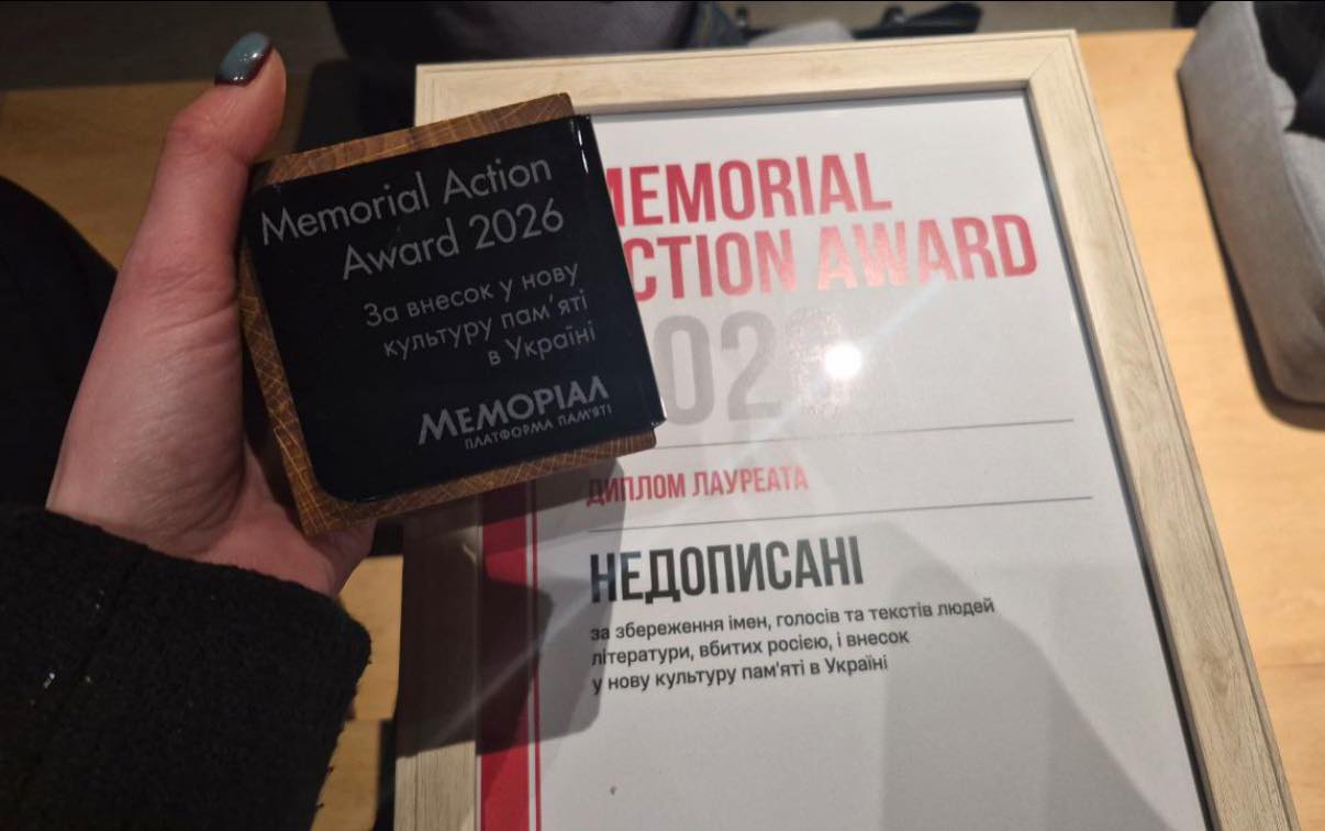 Проєкт «Недописані» отримав відзнаку за внесок у культуру памʼятіВолонтерський проєкт «Недописані», присвячений дієвцям літературної галузі, чиє життя забрала росія, отрммав відзнаку Memorial Action Award 2026 за вагомий внесок у нову культуру памʼят