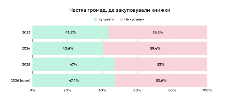 У 2026 році книжки для бібліотек планують купувати 47,4% громад, тоді як 52,6% ні. Якщо у 2023 році книжки для бібліотек купували 43,5% громад, у 2024-му — 40,6%, то у 2025-му — 47%.