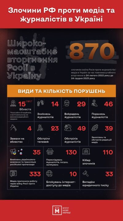У листопаді–грудні 2025 року моніторинг зафіксував два злочини проти медіа та журналістів, скоєні росією. Йдеться про пошкодження редакцій і судовий тиск на українських журналістів, яких утримує рф.