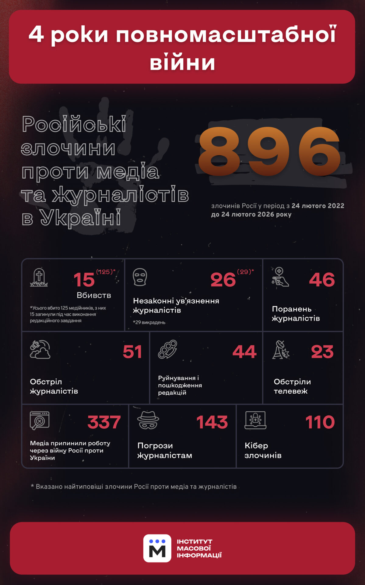 Протягом чотирьох років повномасштабного вторгнення росія скоїла 896 злочинів проти українських журналістів та медіа. Про це повідомляє Інститут масової інформації (ІМІ).