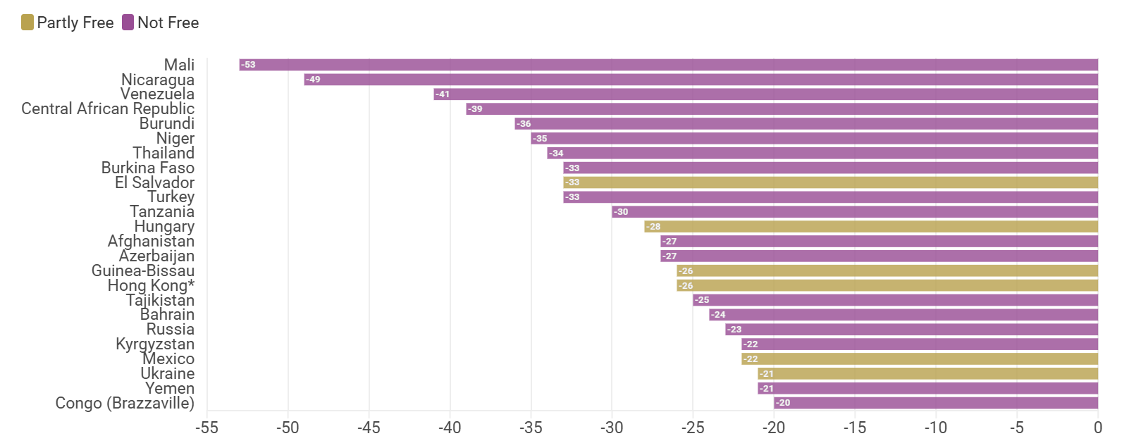 У країнах із найгіршими показниками ситуацію визначали насамперед війни та відкрита репресивна політика держави. У Судані конфлікт між регулярною армією та парамілітарними силами призвів до масових убивств, сексуального насильства і примусового переселення; країна отримала лише 1 бал зі 100. У М’янмі військова хунта, яка веде громадянську війну проти сил спротиву, ще більше обмежила політичну участь і заборонила критику виборчого процесу; країна має 4 бали зі 100. В Ірані влада у 2025 році затримала понад 21 тисячу людей у межах кампанії переслідувань, а також депортувала близько 1,8 мільйона афганських мігрантів і біженців без належних процедур і гарантій базових прав; у підсумку країна отримала 10 балів зі 100.